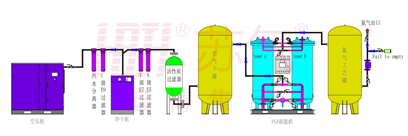 環(huán)境空氣經(jīng)壓縮凈化,除去油、水、塵后,進入由兩個裝填有碳分子篩的吸附塔組成的變壓吸附裝置。壓縮空氣由下至上流經(jīng)吸附 塔,其間氧分子在碳分子篩表面吸附,氮氣由吸附塔上端流出,進入粗氮緩沖罐,經(jīng)過一段時間后,吸附塔中碳分子篩被吸附的氧飽和,需進行再生。再生是通過停止吸附步驟,降低吸附塔壓力來實現(xiàn)的。兩個吸附塔交替進行吸附和再生,從而確保氮氣的連續(xù)輸出。